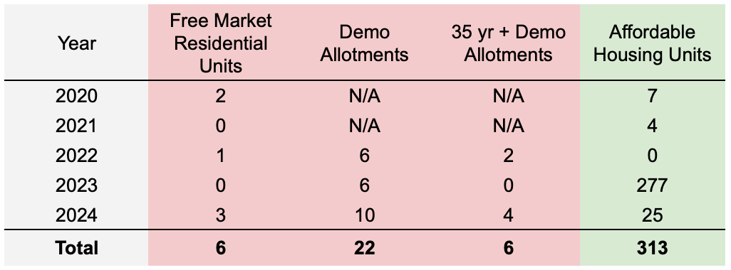 Objectively speaking, Free-Market Residential Units on land that's never been developed has all-but reached build-out, and the creation of new Affordable Housing is making progress relative to the ratio of overall Free-Market Residential Units, while redevelopment of tear down homes has been restricted through the Demo Allotment program.