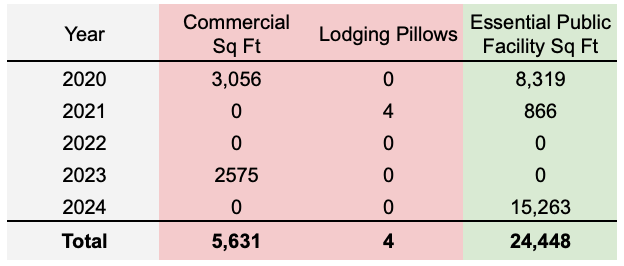 Commercial square shows a similar story: Essentially Public Facility square footage created is outpacing new free-market Commercial and Lodging development.
