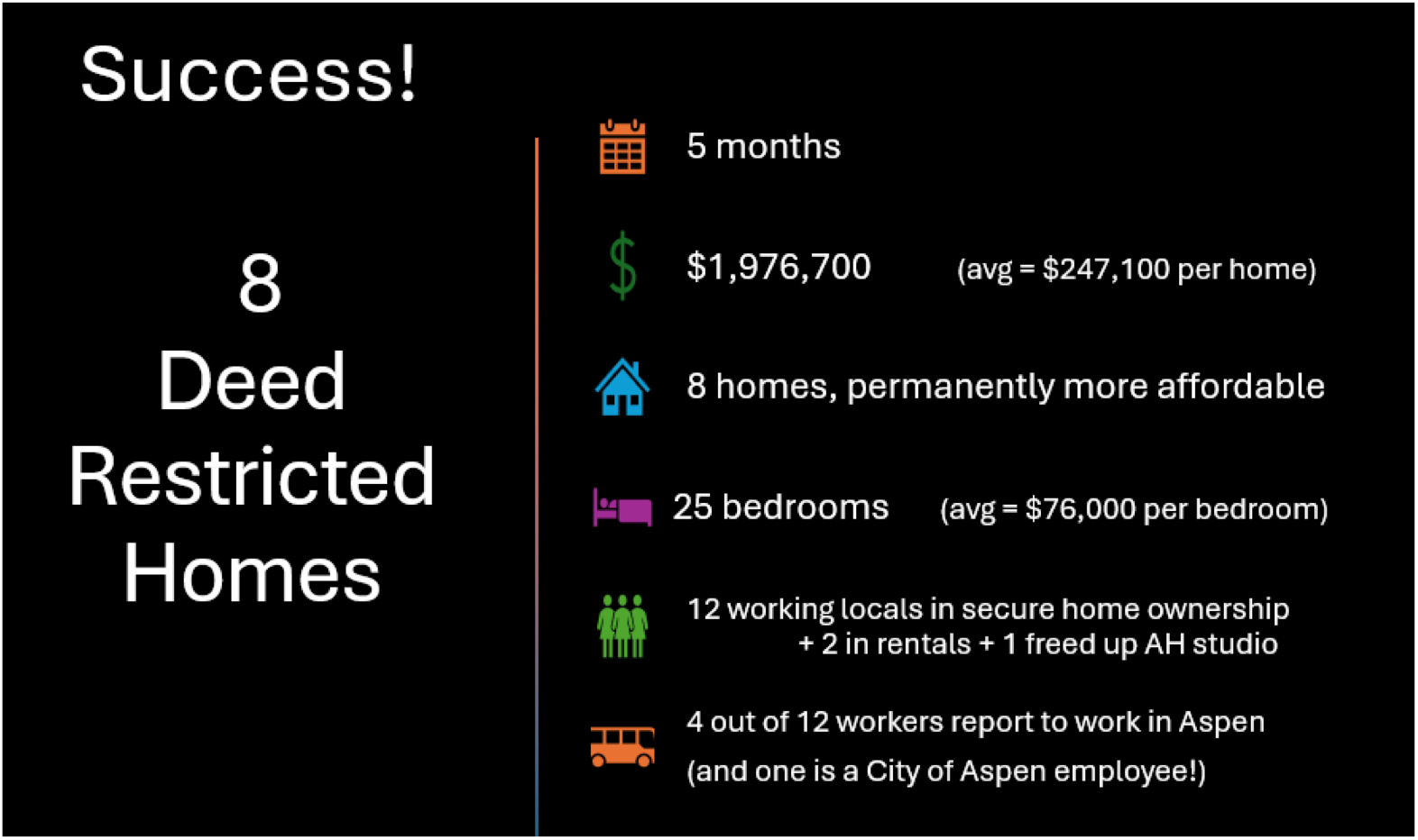 The West Mountain Regional Housing Coalition provides an update to the COA on achieving success in it's first five months. With $2M in funding, the program has deed-restricted 8 homes with price caps including: 3 homes in Carbondale, 4 in Glenwood springs, 1 in Rifle. Among the residents, 4 out of 12 are workers in Aspen.
