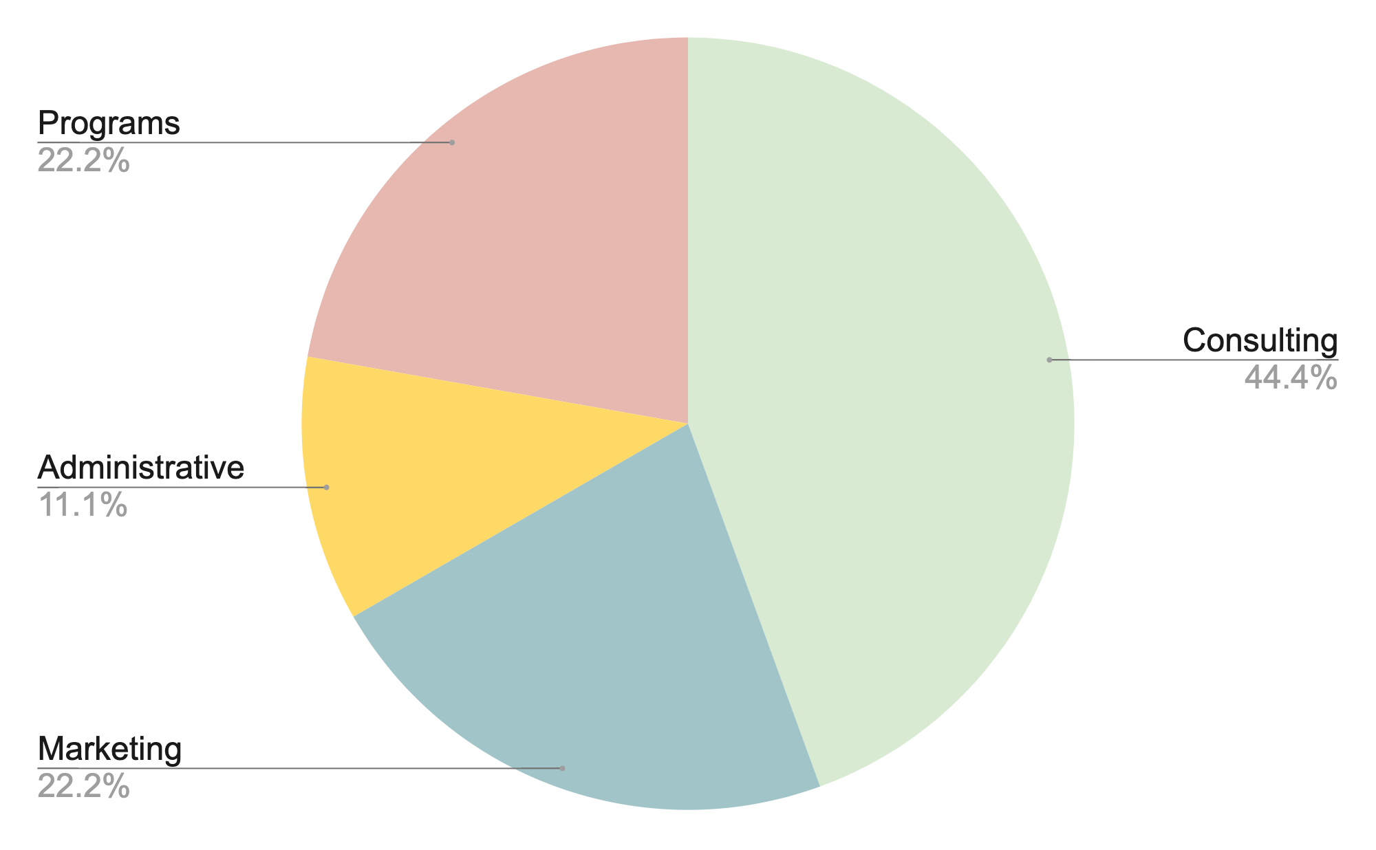 - Programs - we plan to host small gatherings and events. Some of our program expenses will include compensating other organizations or individuals, printing, technology, space rental, and food & drinks.