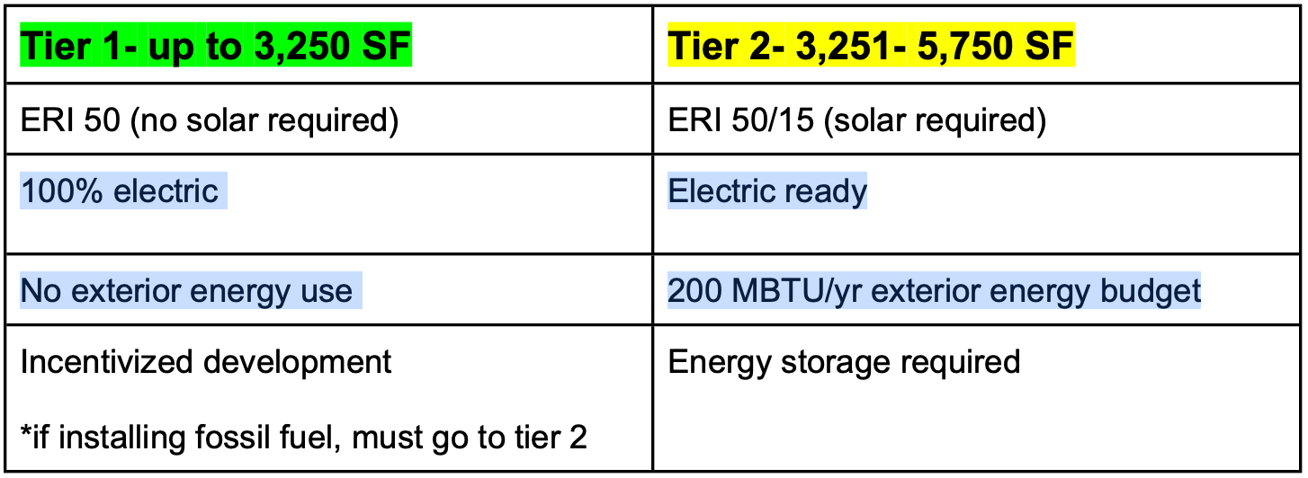 Staff will present to the BOCC more energy code updates with the continued goal: 1) Reduce annual emissions by 90% from 2019 levels by 2050; and 2) Require all new residential development to be net zero by 2030. Two tiers of energy usage are recommended by staff: