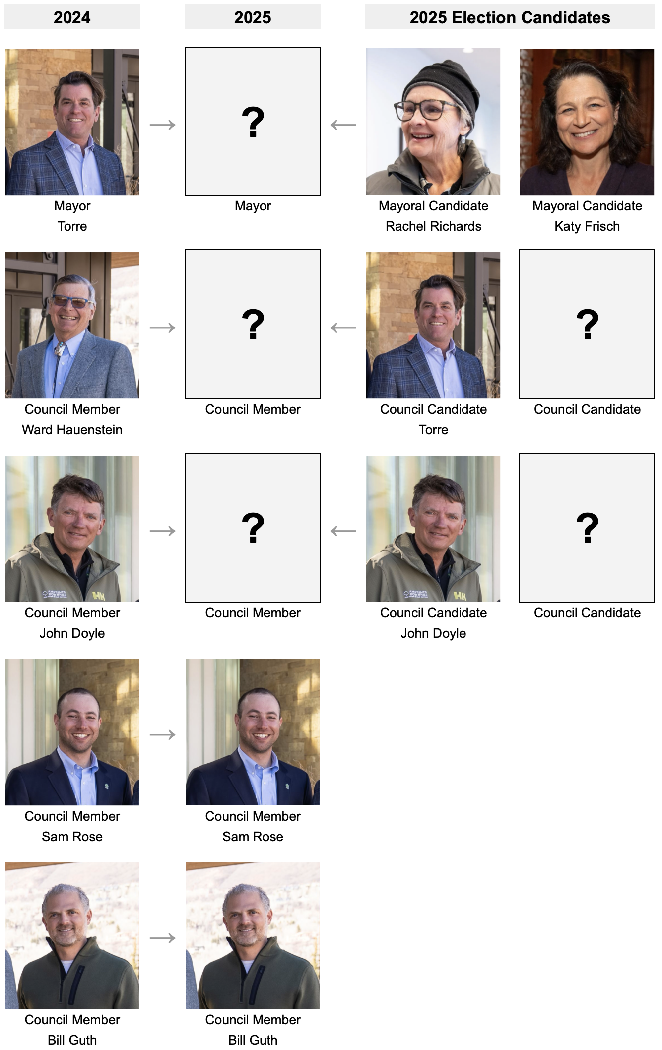 The deadline for signatures and paperwork is December 23. Three seats are up for election: Mayor Torre, who is completing his final term, and Council Member Ward Hauenstein, who is also finishing his term. Council Member John Doyle is seeking re-election, while Sam Rose and Bill Guth will continue serving their remaining two-year terms.