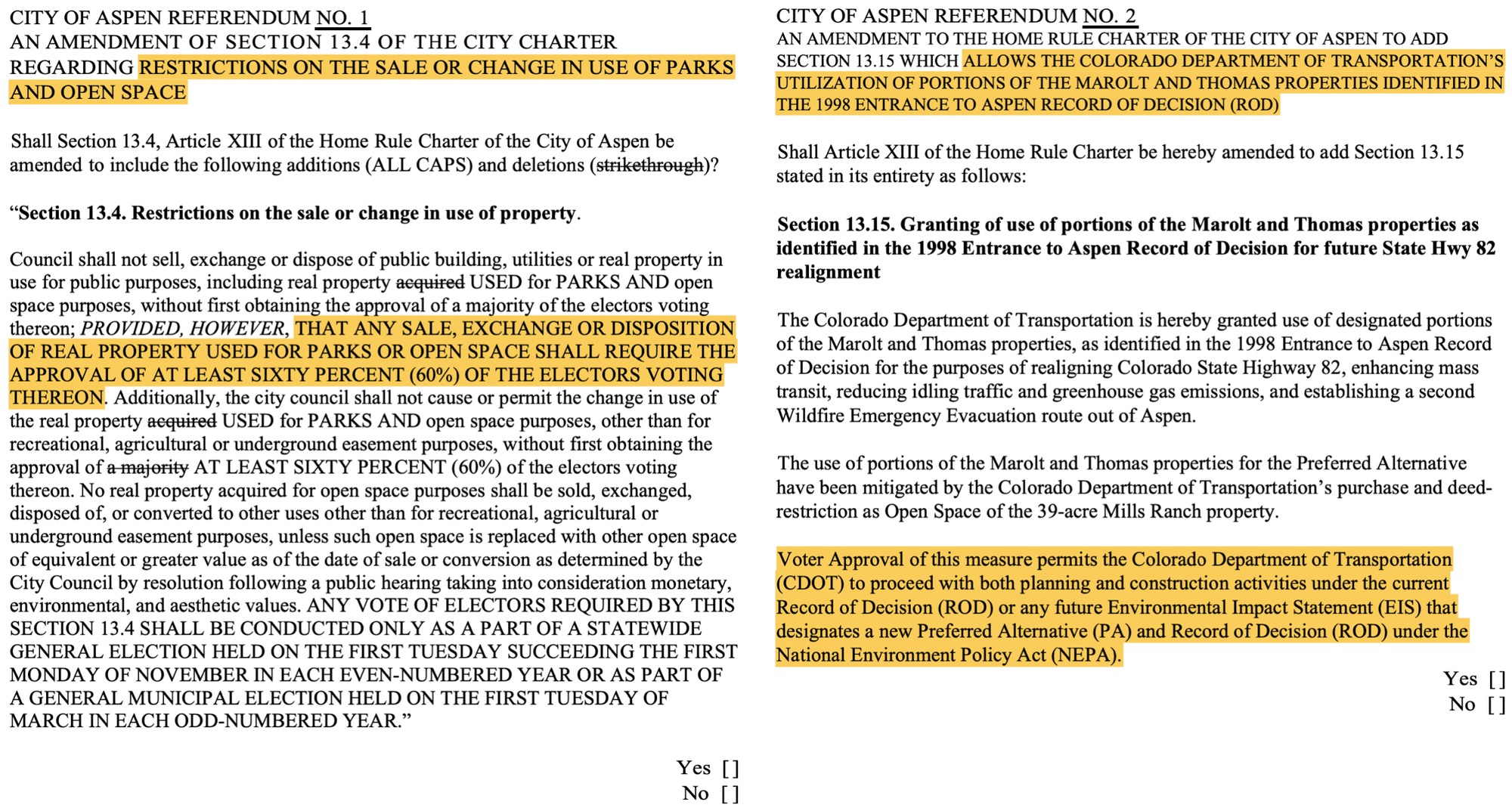 On Tuesday, council approved ballot language for two opposing referendums related to the Entrance to Aspen. Referendum No. 1 seeks to amend the city charter requiring that any sale, exchange or disposition of any park or opens space requires approval by least 60% of the electors voting. This goes against Referendum No. 2, which seeks to allow the Colorado Department of Transportation (CDOT) authority for the utilization of portions of Marolt Open Space and Thomas properties for the Preferred Alternative memorialized in the Record of Decision (ROD).